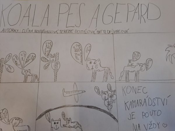 Učili jsme se o bajkách, některé jsme si přečetli a potom jsme vytvářeli své vlastní v podobě komiksu. Samozřejmě nechybí ani poučení z příběhu, jak to má v bajce být.