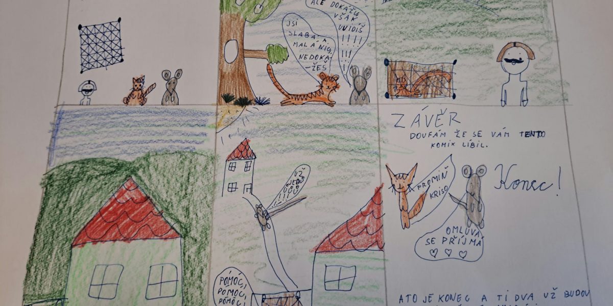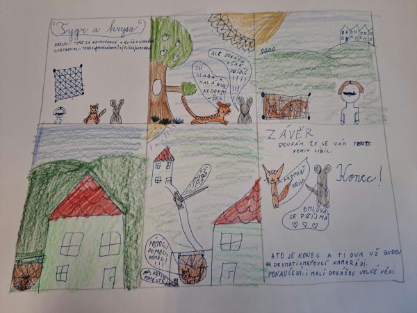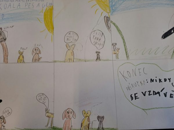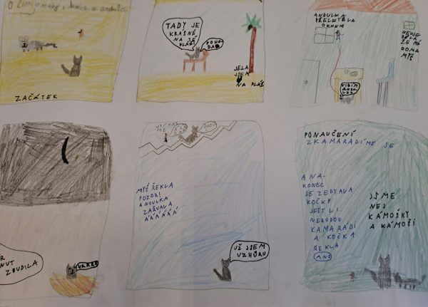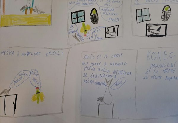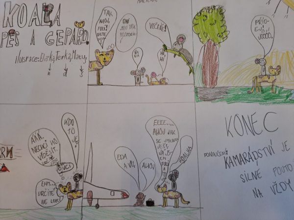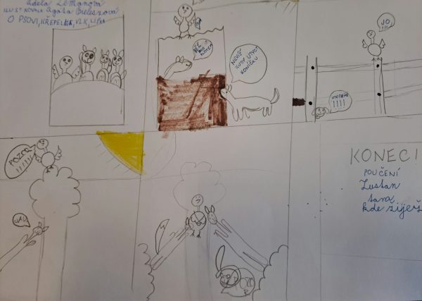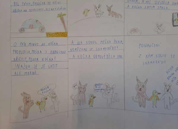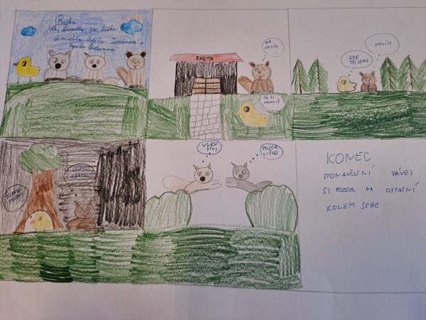 Učili jsme se o bajkách, některé jsme si přečetli a potom jsme vytvářeli své vlastní v podobě komiksu. Samozřejmě nechybí ani poučení z příběhu, jak to má v bajce být.