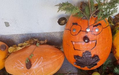 Krásné počasí nás vylákalo ven tvořit z přírodnin. Housenky z listí a skřítci z dýní se moc povedli.