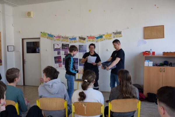Dne 17. března 2026 proběhl ve třídě 7.A speciální vzdělávací program – Den se záchranáři. Do školy zavítali profesionální záchranáři Dáša a Jirka, kteří si pro žáky připravili praktickou ukázku první pomoci a připomněli jim, jak důležité je vědět, jak v krizových situacích správně reagovat.