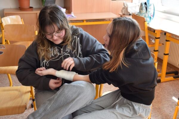 Po teorii následovala praktická část. Záchranáři žákům ukázali, jak rychle zastavit masivní krvácení, jak správně přiložit tlakový obvaz a jakposoudit situaci a jednat bezpečně.