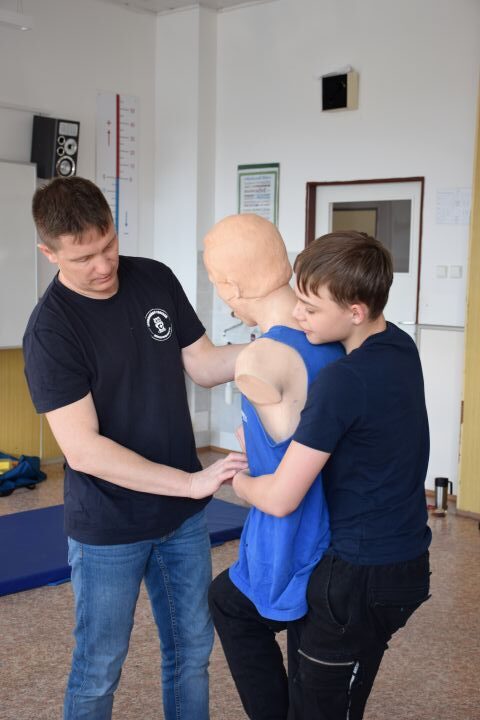 Dalším důležitým tématem byla první pomoc při dušení. Děti si vyzkoušely postupy na speciální figuríně a trénovaly Heimlichův manévr. Získaly tak představu o tom, jak může vypadat reálná situace a jak rychle je potřeba reagovat.
