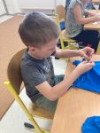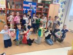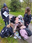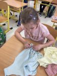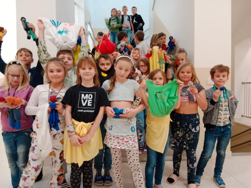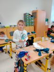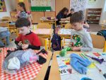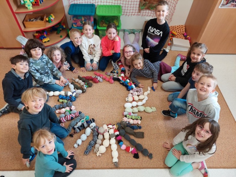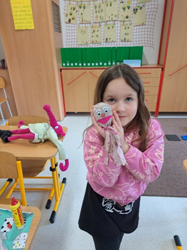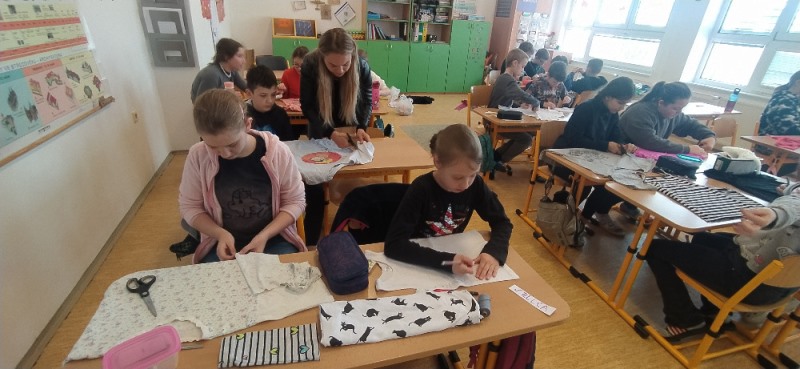Děti si přinesly do školy stará trička, ponožky a další kousky, které v šatníku ležely ladem, a zkoušeli jsme jim vdechnout nový život. Výsledkem byly hračky – chobotnice, housenky, maňásci a další, tašky, nové modely oblečení, polštáře, malovaná trička a další výrobky. Starší děti odvážně vyrazily do parku, i když počasí bylo chladné, a plnily tam úkoly související s tématem.