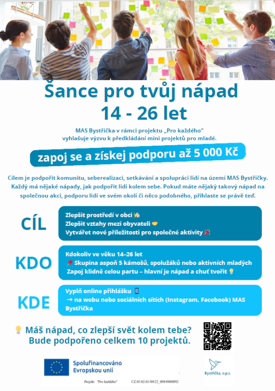 Výzva na zapojení mladých do tvorby miniprojektů v rámci našeho mikroregionu. Cílem je pozvednout aktivitu mladých a více je motivovat. Cílem je podpořit komunitu, seberealizaci, setkávání a spolupráci lidí na území MAS Bystřičky. Každý má nějaké nápady, jak podpořit lidi kolem sebe. Pokud máte nějaký takový nápad na společnou akci, podporu lidí ve svém okolí či něco podobného, přihlaste se právě teď. Vzhledem k rozpočtu můžeme nyní podpořit max. 10 projektů.