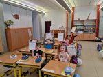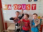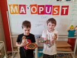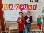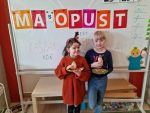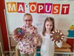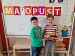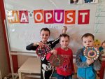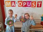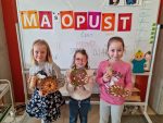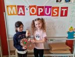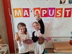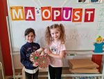 V pondělí a úterý jsme se i u nás ve třídě pečlivě připravovali na oslavu masopustu v amfiteátru společně s béčkem a všemi druháky. Vysvětlovali jsme si, co to vůbec je, jak se slaví u nás na Hané, zpivali jsme a tančili, pekli koláče z plastelíny a plnili jitrnice vatou. V úterý jsme si pak už v převleku za maškary pořádně užili společný tanec s medvědem.