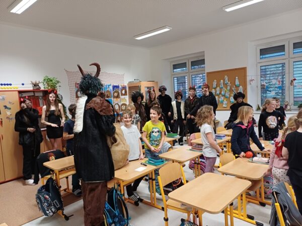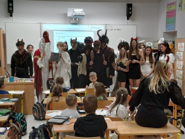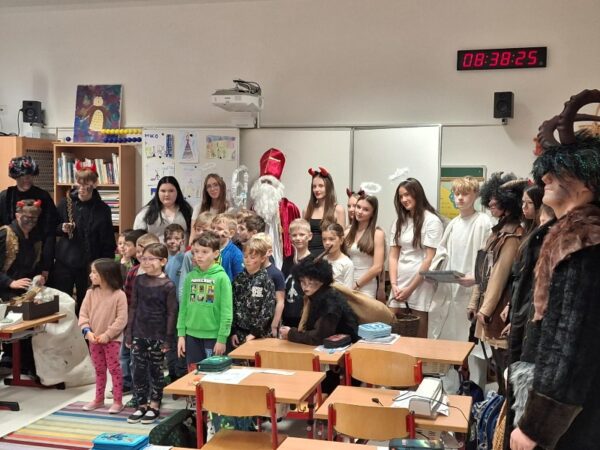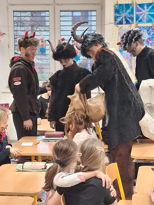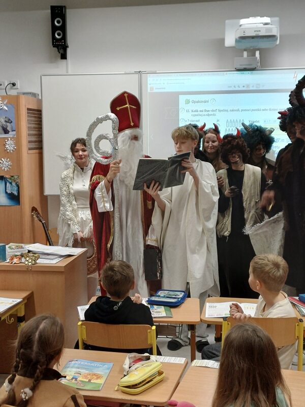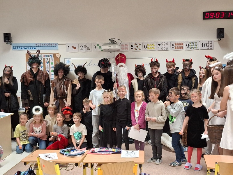 V pátek 5. prosince zavítal do tříd prvního stupně Mikuláš se svou družinou čertů a andělů v podání našich šikovných deváťáků. Ti se rolí ujali s opravdovým nasazením a vytvořili ve škole tu pravou mikulášskou atmosféru.