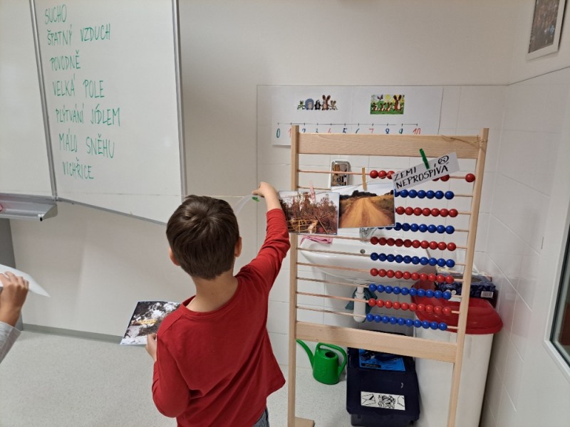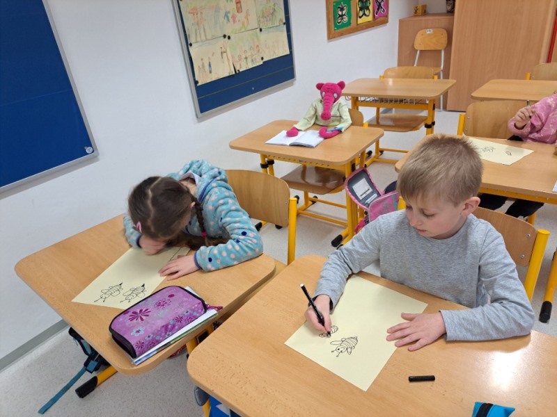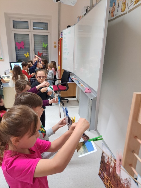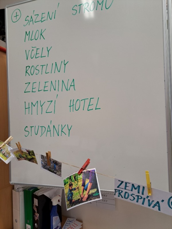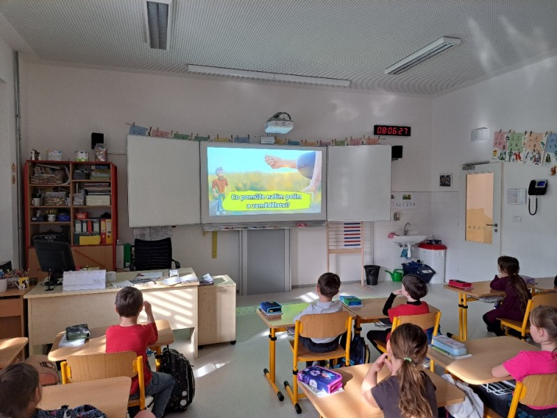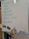 Nejdřív jsme se podívali na video, povídali jsme si o tom, co naší krajině prospívá a co jí nedělá dobře. Pak jsme si to vyzkoušeli poz poznat i na fotografiích a roztřídili jsme je. Protože už víme, že musíme v krajině chránit hmyz, nakreslili jsme si potom krásné včelky a úly.