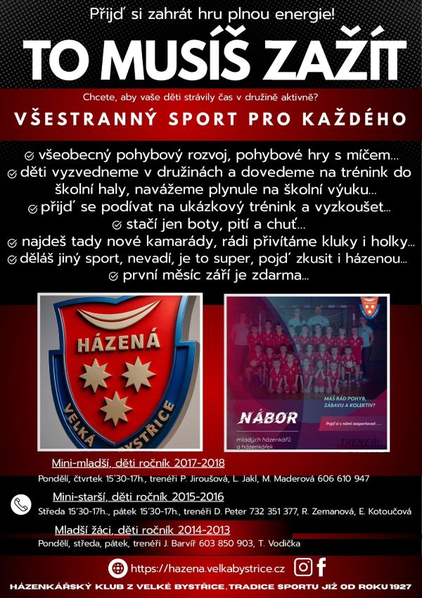 • VYBÍJENÁ pro děti z 3. – 5. tříd, každý čtvrtek od 12:20 do 13:00 ve školní hale, kontakt: anna. frystacka@mzs-vb.cz
