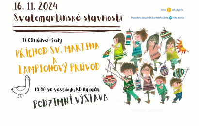 Zveme Vás na Svatomartinské slavnosti a lampionový průvod s doprovodem sv. Martina, který bude vycházet tuto sobotu 16. 11. 2024 v 17 hodin z nádvoří školy. Ve vestibulu KD Nadační bude od 15 hodin výstava podzimní tvorby dětí naší školy. Těšíme se na Vás!