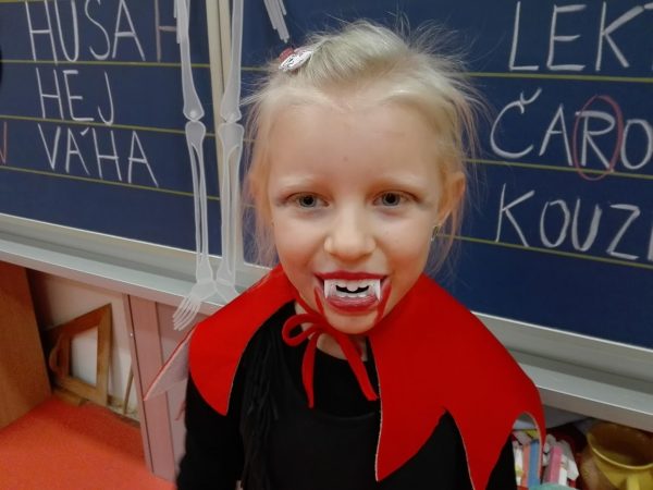 V pátek po podzimních prázdninách jsme spojili Halloween a naše tradiční Dušičky. U nás ve škole se tento den sešlo opravdu hodně strašidelných bytostí. Ve třídě nás čekalo mnoho překvapení – tma a světla z luceren, strašidelná hudba, čáry, kouzla a stará čarodějnice místo paní učitelky.