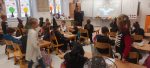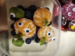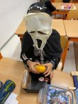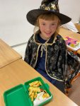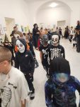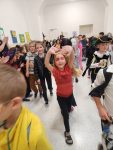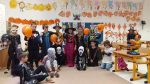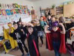 Když už byla na halloweenský den ve škole vyhlášena soutěž o nejstrašidelnější fotografii třídy, využili jsme na našem patře přední budovy příležitosti a uspořádali jsme si strašidelnou školu. Strašidla se ve škole učila také číst, psát a počítat, ale samozřejmě strašidlácky. Kromě toho jsme měli i přehlídku masek, příšerné svačinky (rodiče mají neuvěřitelnou fantazii) a při kolování po ostatních třídách jsme si zatančili, zazpívali, vyráběli a vyzkoušeli své vědomosti o historii těchto tajemných podzimních svátků.