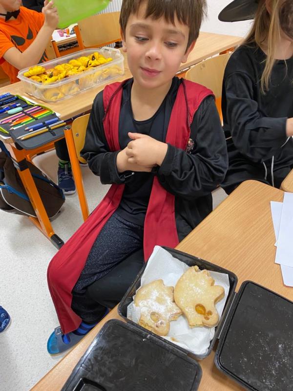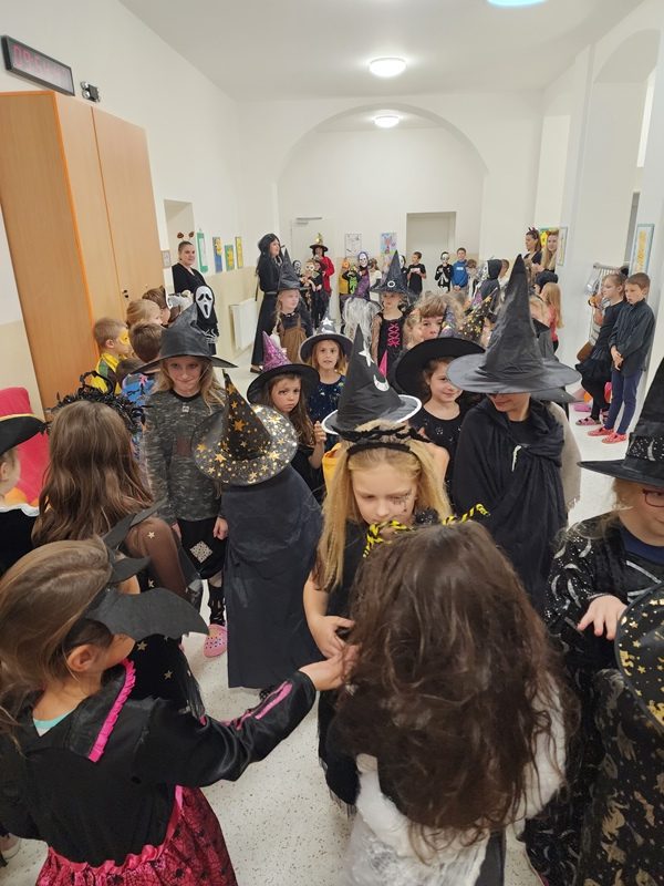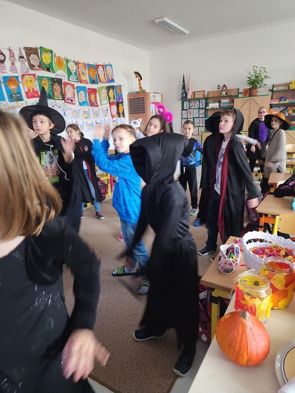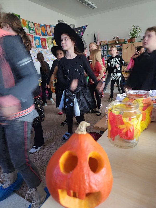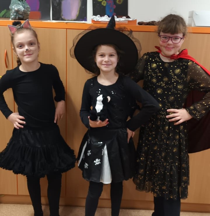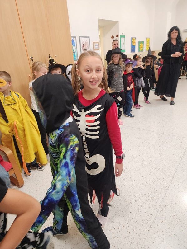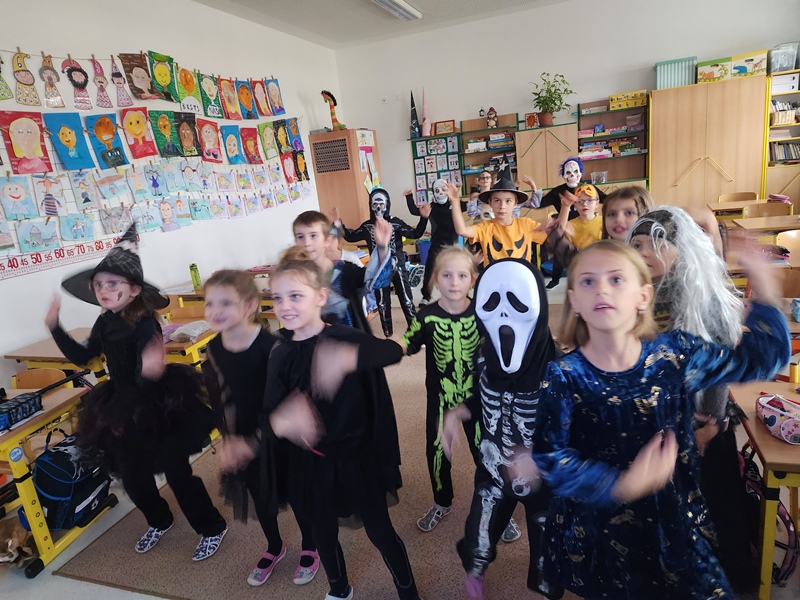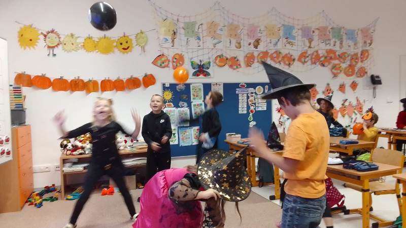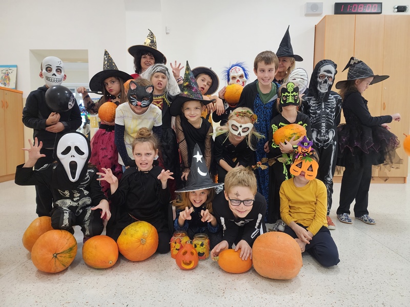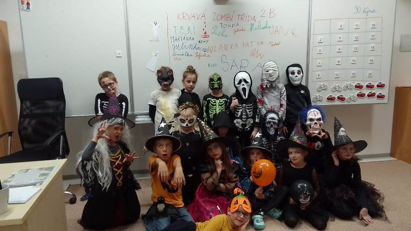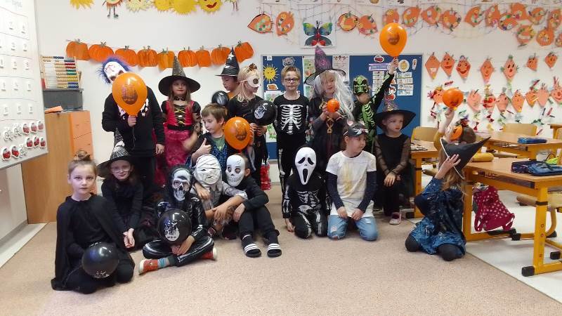 Když už byla na halloweenský den ve škole vyhlášena soutěž o nejstrašidelnější fotografii třídy, využili jsme na našem patře přední budovy příležitosti a uspořádali jsme si strašidelnou školu. Strašidla se ve škole učila také číst, psát a počítat, ale samozřejmě strašidlácky. Kromě toho jsme měli i přehlídku masek, příšerné svačinky (rodiče mají neuvěřitelnou fantazii) a při kolování po ostatních třídách jsme si zatančili, zazpívali, vyráběli a vyzkoušeli své vědomosti o historii těchto tajemných podzimních svátků.