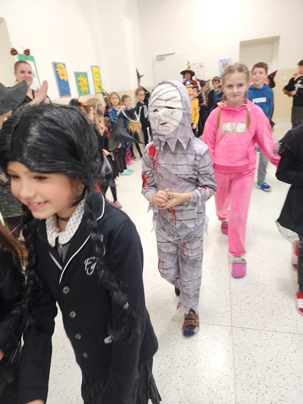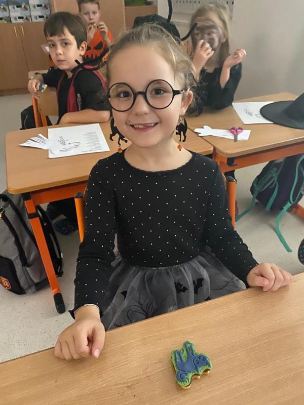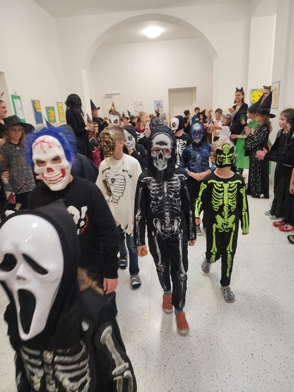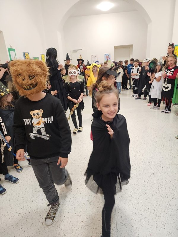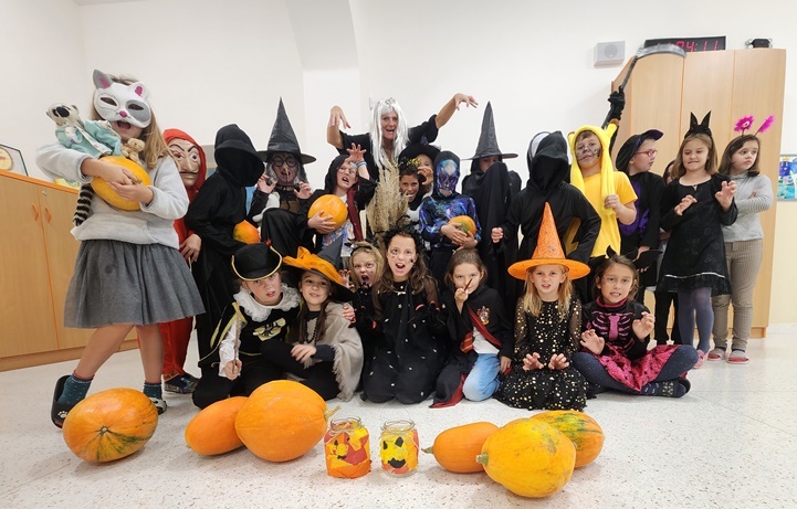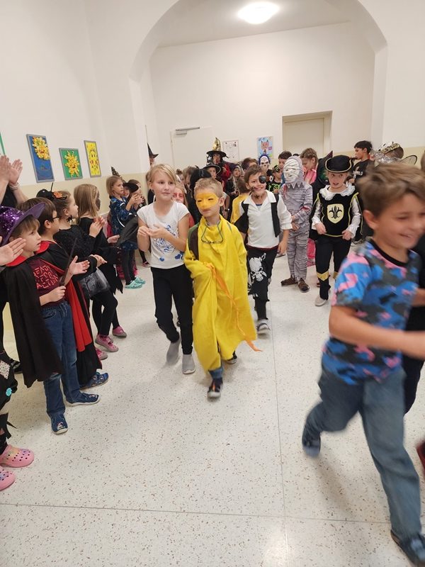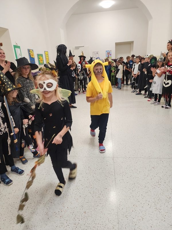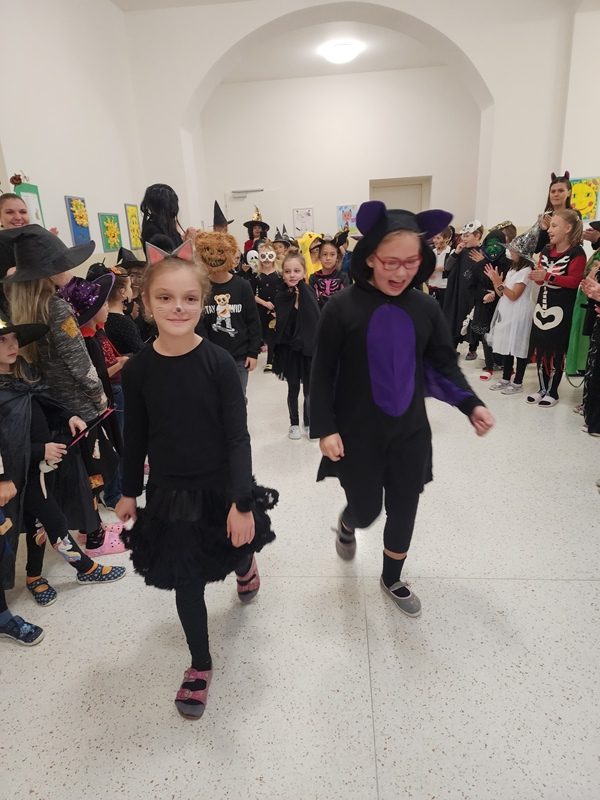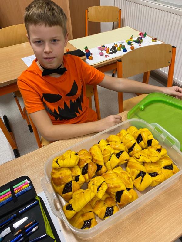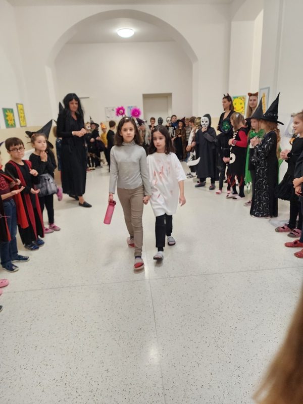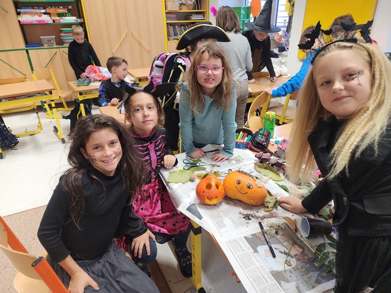Když už byla na halloweenský den ve škole vyhlášena soutěž o nejstrašidelnější fotografii třídy, využili jsme na našem patře přední budovy příležitosti a uspořádali jsme si strašidelnou školu. Strašidla se ve škole učila také číst, psát a počítat, ale samozřejmě strašidlácky. Kromě toho jsme měli i přehlídku masek, příšerné svačinky (rodiče mají neuvěřitelnou fantazii) a při kolování po ostatních třídách jsme si zatančili, zazpívali, vyráběli a vyzkoušeli své vědomosti o historii těchto tajemných podzimních svátků.