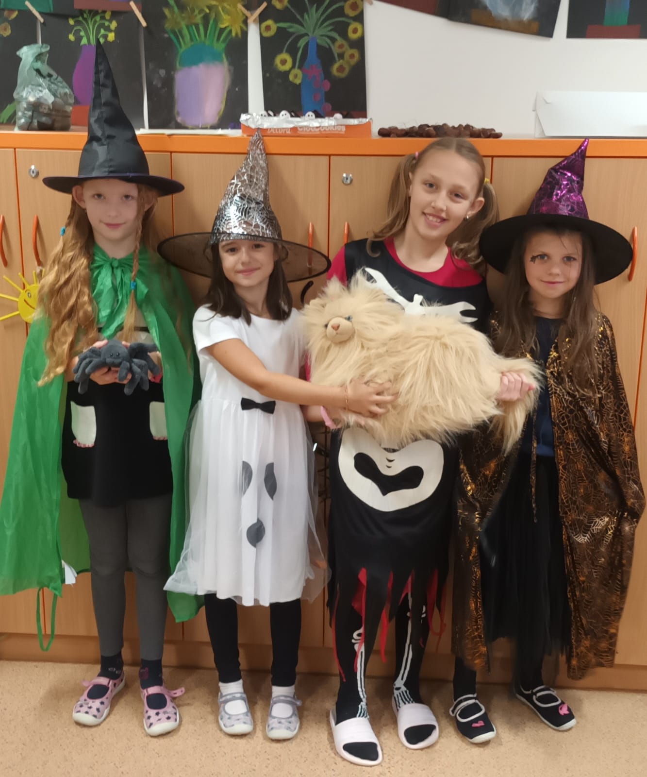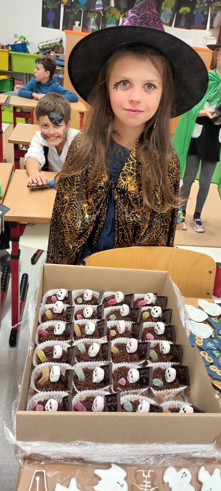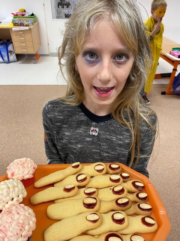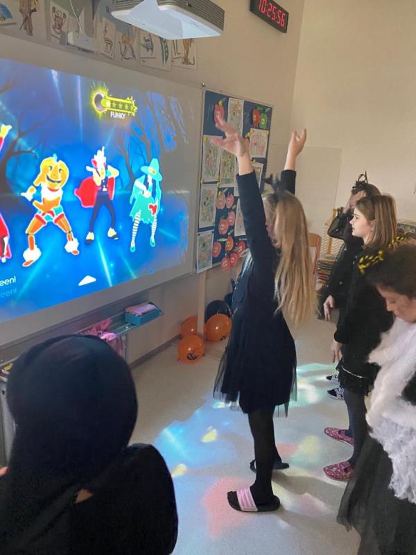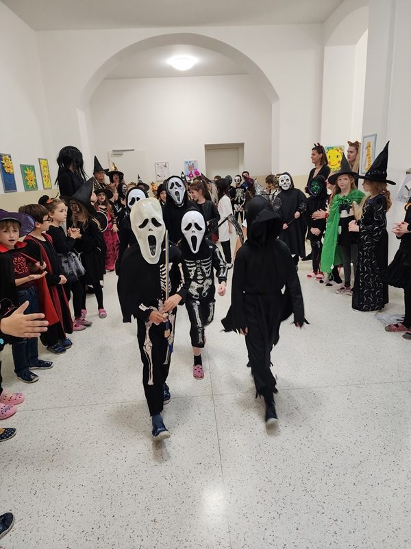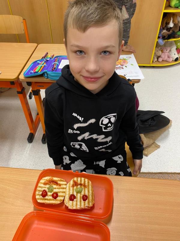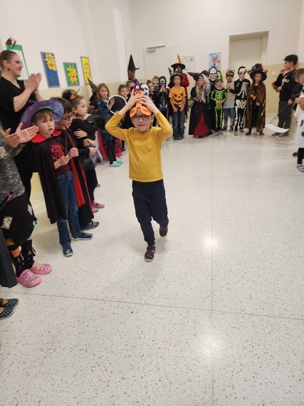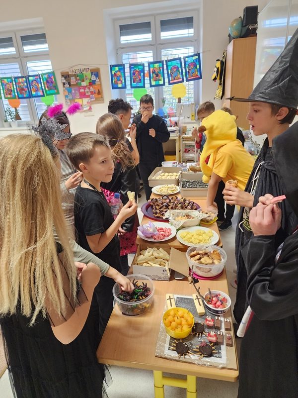 Když už byla na halloweenský den ve škole vyhlášena soutěž o nejstrašidelnější fotografii třídy, využili jsme na našem patře přední budovy příležitosti a uspořádali jsme si strašidelnou školu. Strašidla se ve škole učila také číst, psát a počítat, ale samozřejmě strašidlácky. Kromě toho jsme měli i přehlídku masek, příšerné svačinky (rodiče mají neuvěřitelnou fantazii) a při kolování po ostatních třídách jsme si zatančili, zazpívali, vyráběli a vyzkoušeli své vědomosti o historii těchto tajemných podzimních svátků.