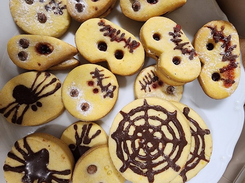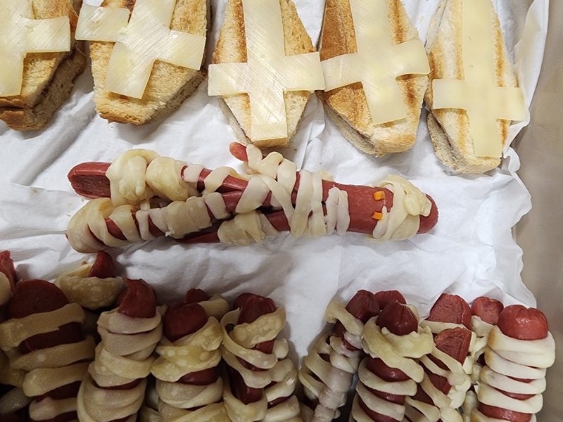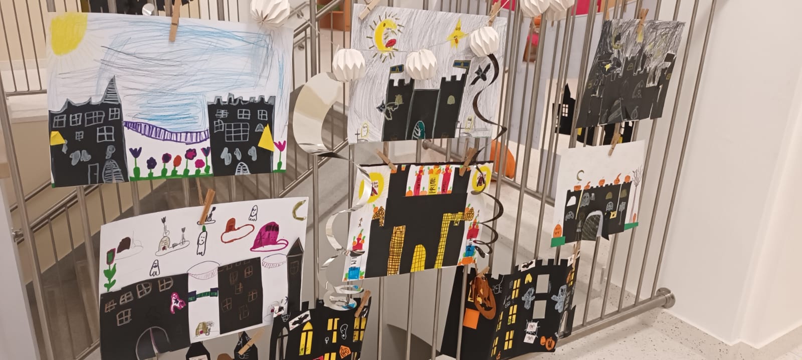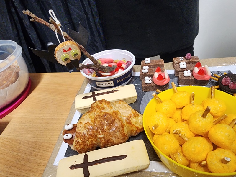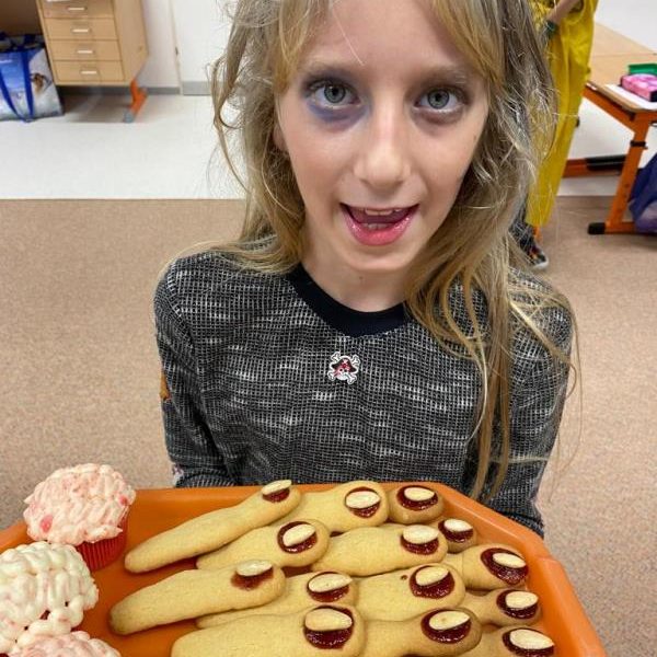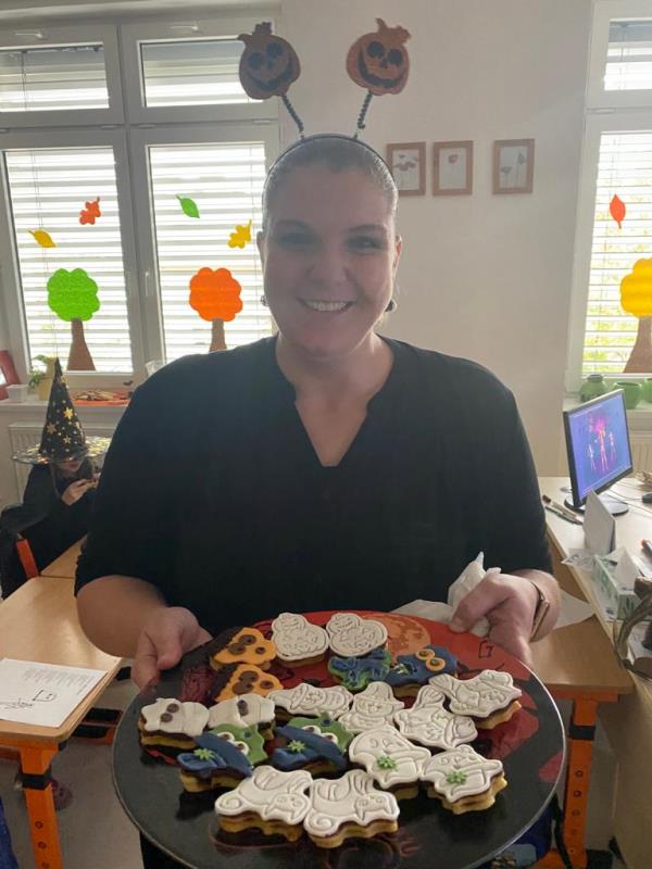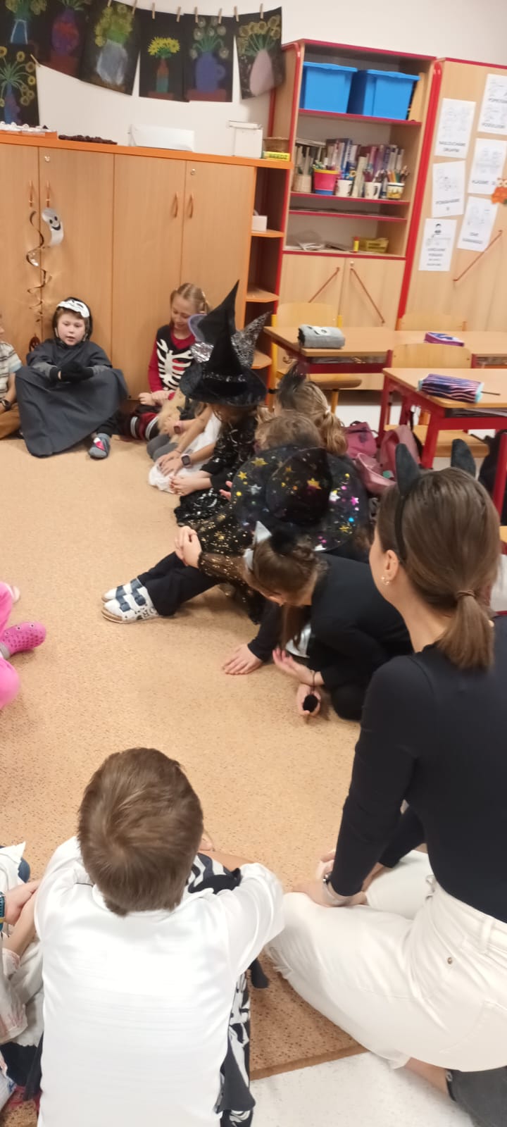 Když už byla na halloweenský den ve škole vyhlášena soutěž o nejstrašidelnější fotografii třídy, využili jsme na našem patře přední budovy příležitosti a uspořádali jsme si strašidelnou školu. Strašidla se ve škole učila také číst, psát a počítat, ale samozřejmě strašidlácky. Kromě toho jsme měli i přehlídku masek, příšerné svačinky (rodiče mají neuvěřitelnou fantazii) a při kolování po ostatních třídách jsme si zatančili, zazpívali, vyráběli a vyzkoušeli své vědomosti o historii těchto tajemných podzimních svátků.