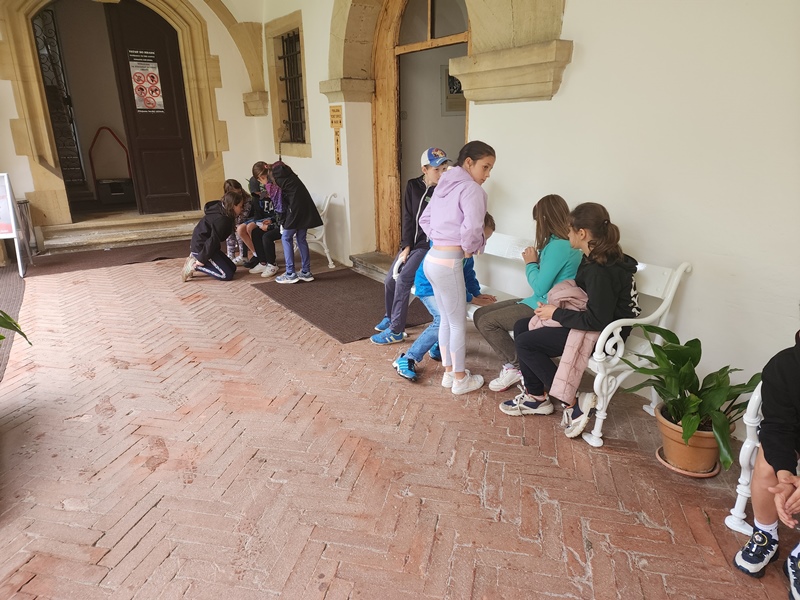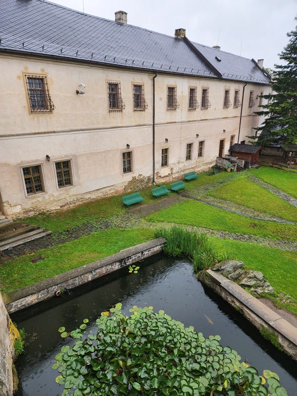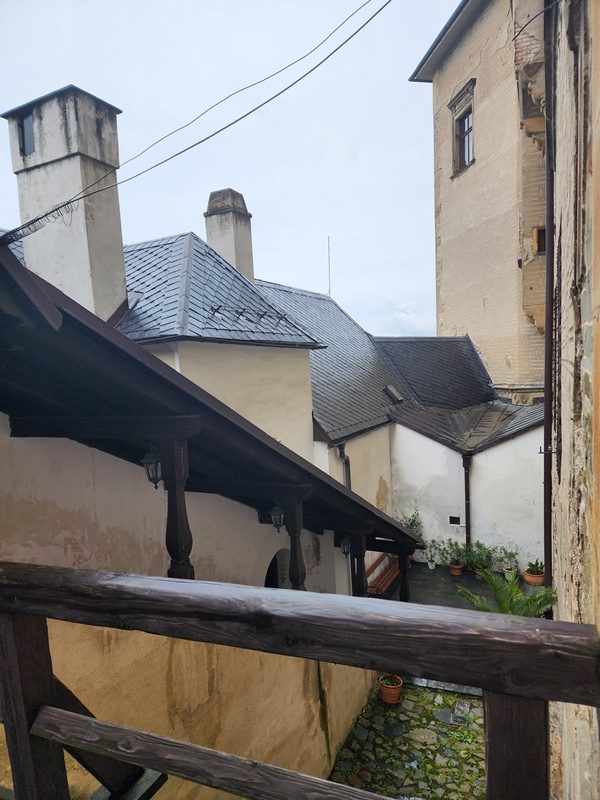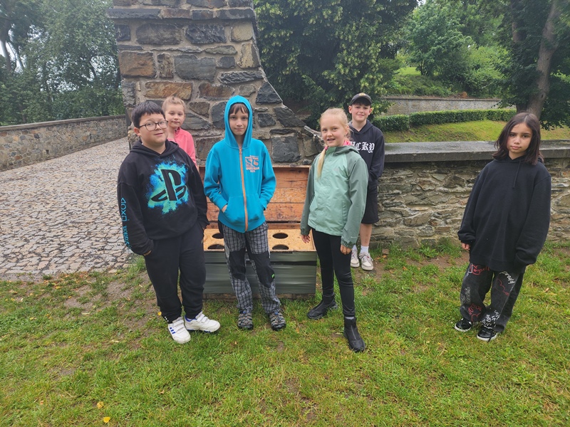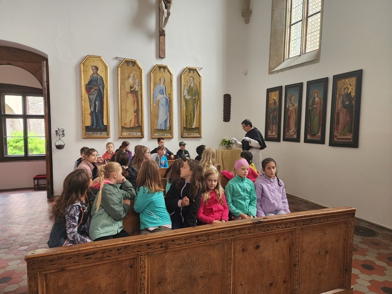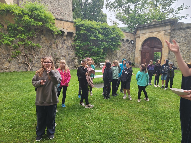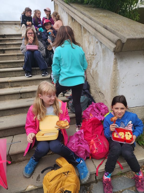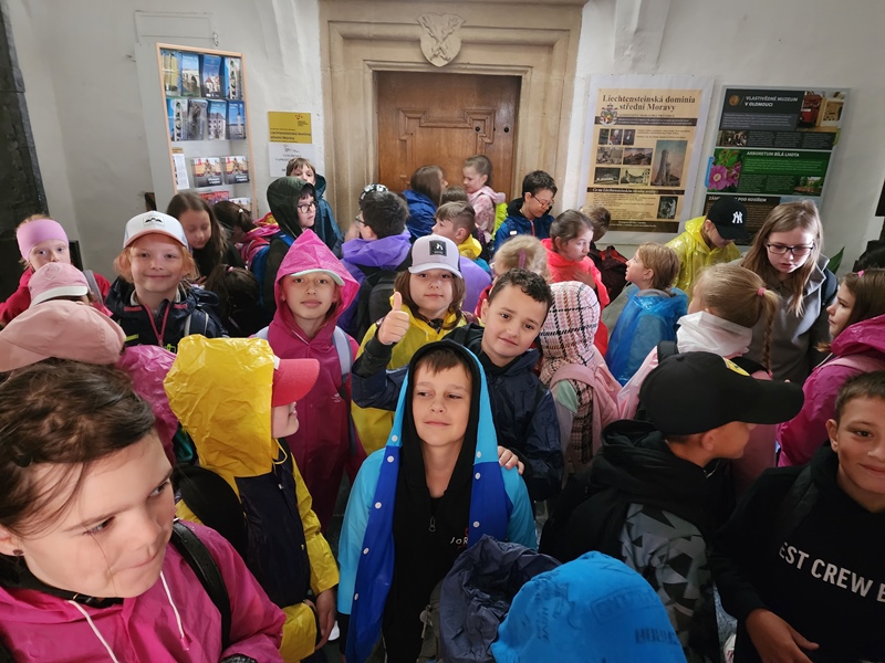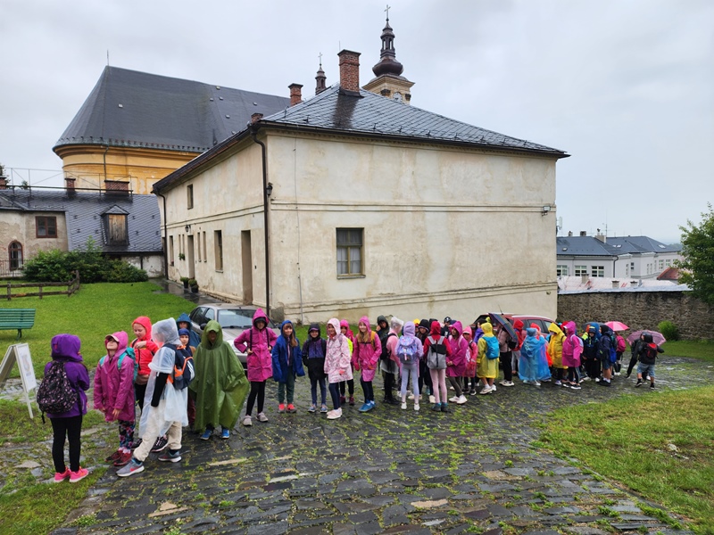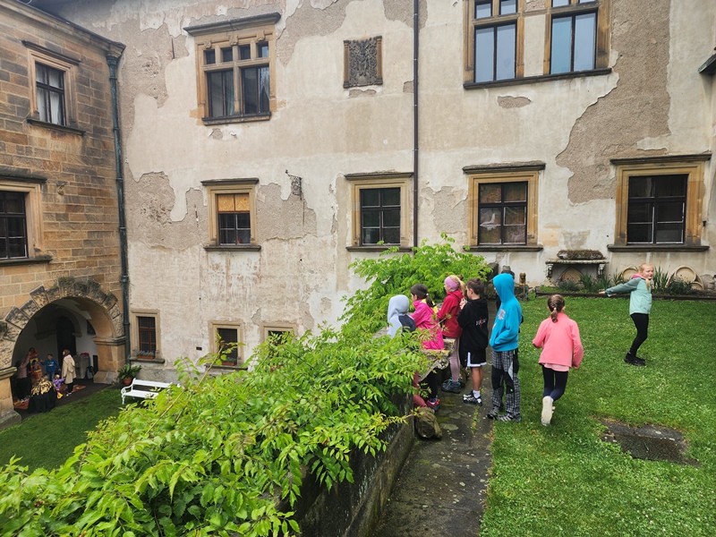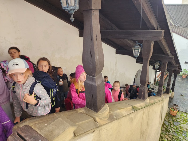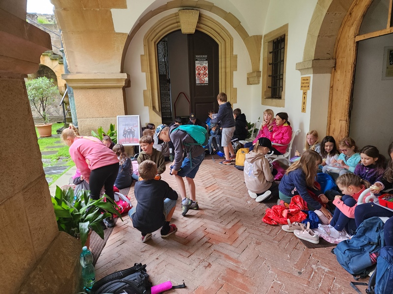 Na cestu od autobusu na hrad jsme sice museli obléct pláštěnky, ale potom už jsme je nepotřebovali. V hradě neprší a na cestu zpět už se počasí umoudřilo. Tak jsme si obědy od našich maminek mohli vychutnat na nádvoří.