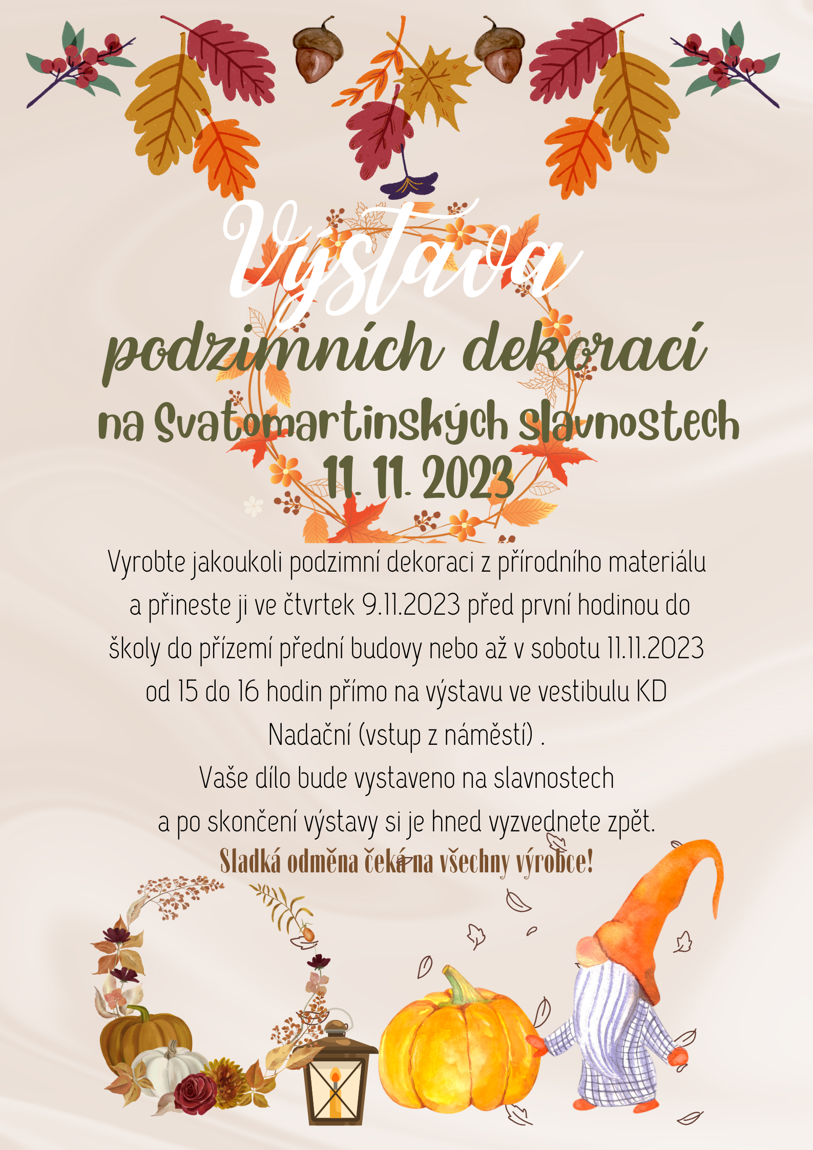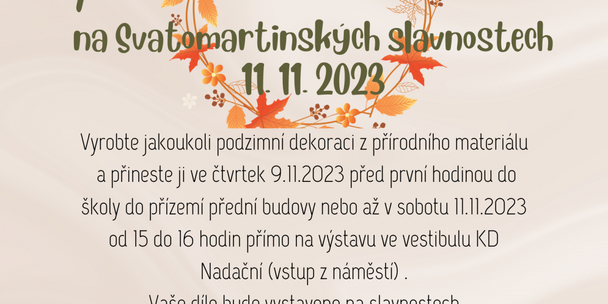 Vyrobte jakoukoli podzimní dekoraci z přírodního materiálu a přineste ji ve čtvrtek 9.11.2023 před první hodinou do školy do přízemí přední budovy nebo až v sobotu 11.11.2023 od 15 do 16 hodin přímo na výstavu ve vestibulu KD Nadační (vstup z náměstí) . Vaše dílo bude vystaveno na slavnostech a po skončení výstavy si je hned vyzvednete zpět. Sladká odměna čeká na všechny výrobce!